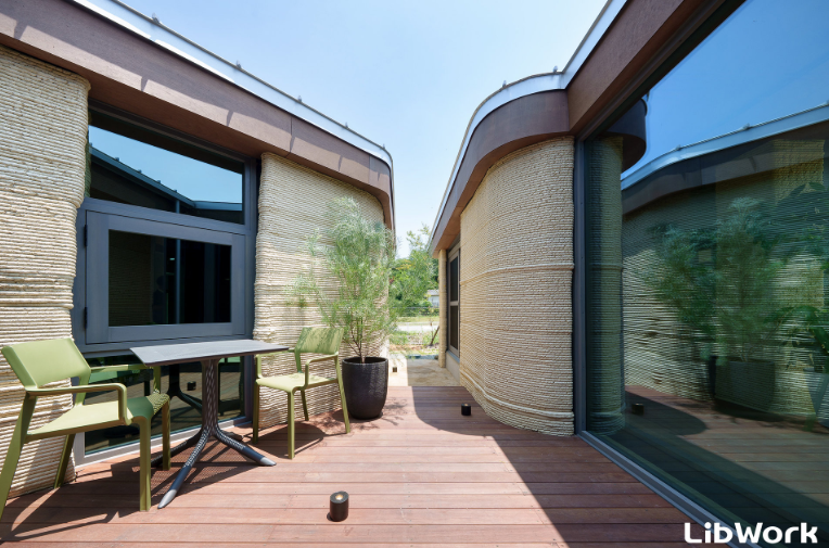 施工工藝:工廠預制打印+現場拼裝,房屋、庭院墻、屏風墻、雕塑、景觀、地磚等均采用3D打印方式建造